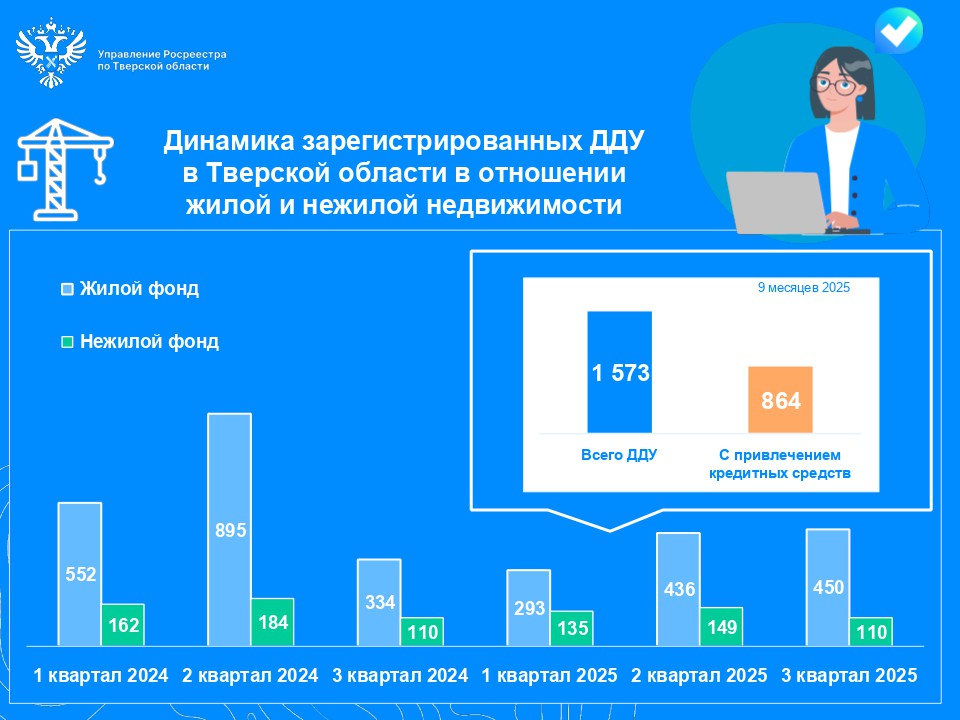 Согласно статистике Управления Росреестра по Тверской области всего за 9 месяцев 2025 года зарегистрировано 1573 договора участия в долевом строительстве (ДДУ), 55% из них (864 ДДУ) — с привлечением кредитных средств.