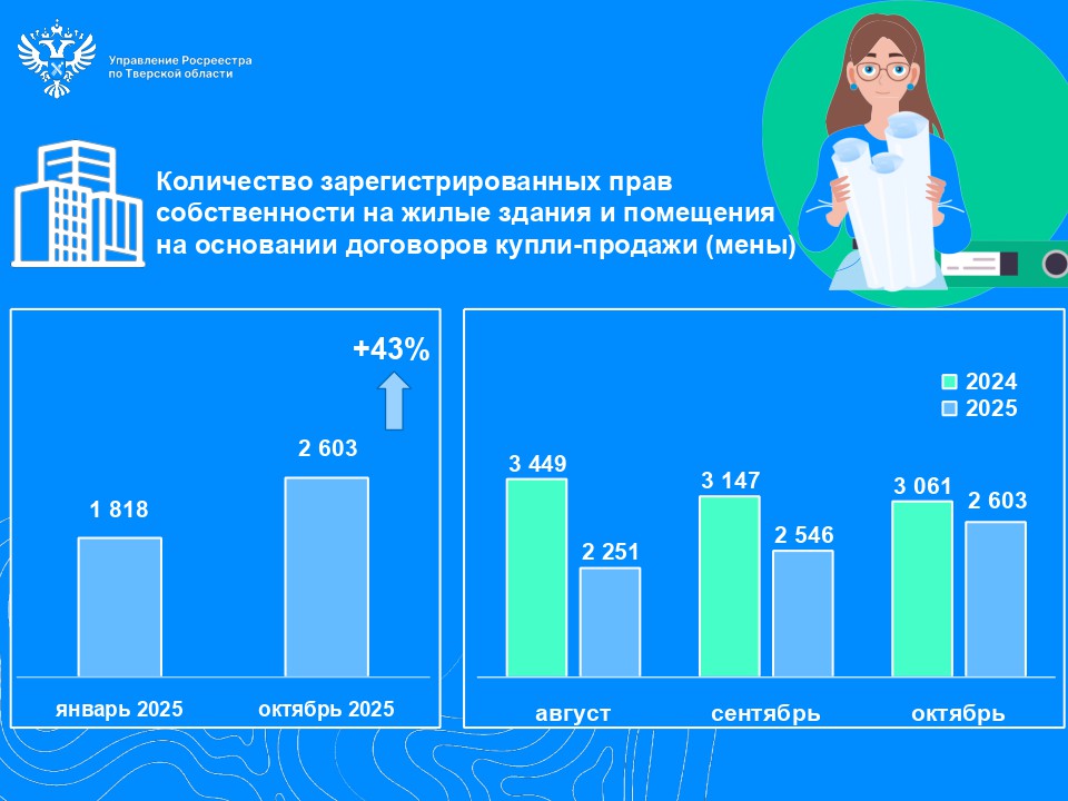 Согласно статистике Управления Росреестра по Тверской области, в октябре 2025 года общее количество прав собственности в отношении объектов жилищного фонда, зарегистрированных на основании договоров купли-продажи/мены, составило 2,6 тыс. Это на 43% больше в сравнении с показателем января 2025 года (1,8 тыс.).