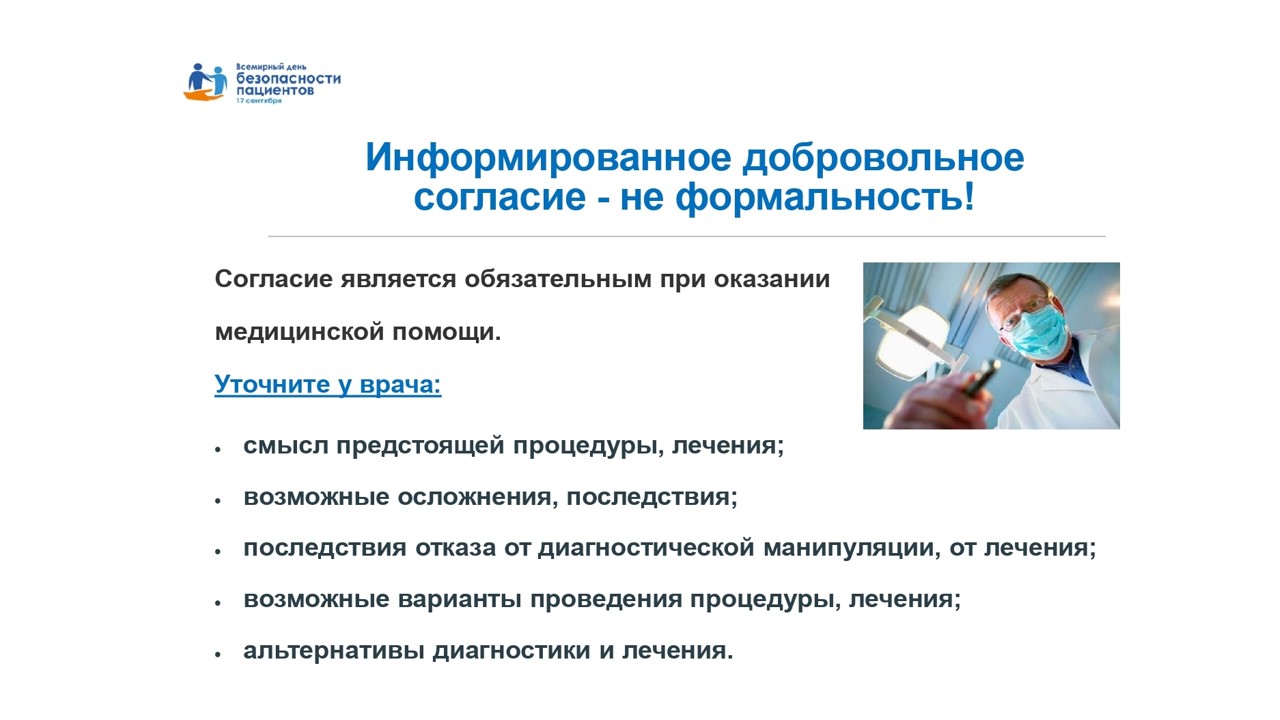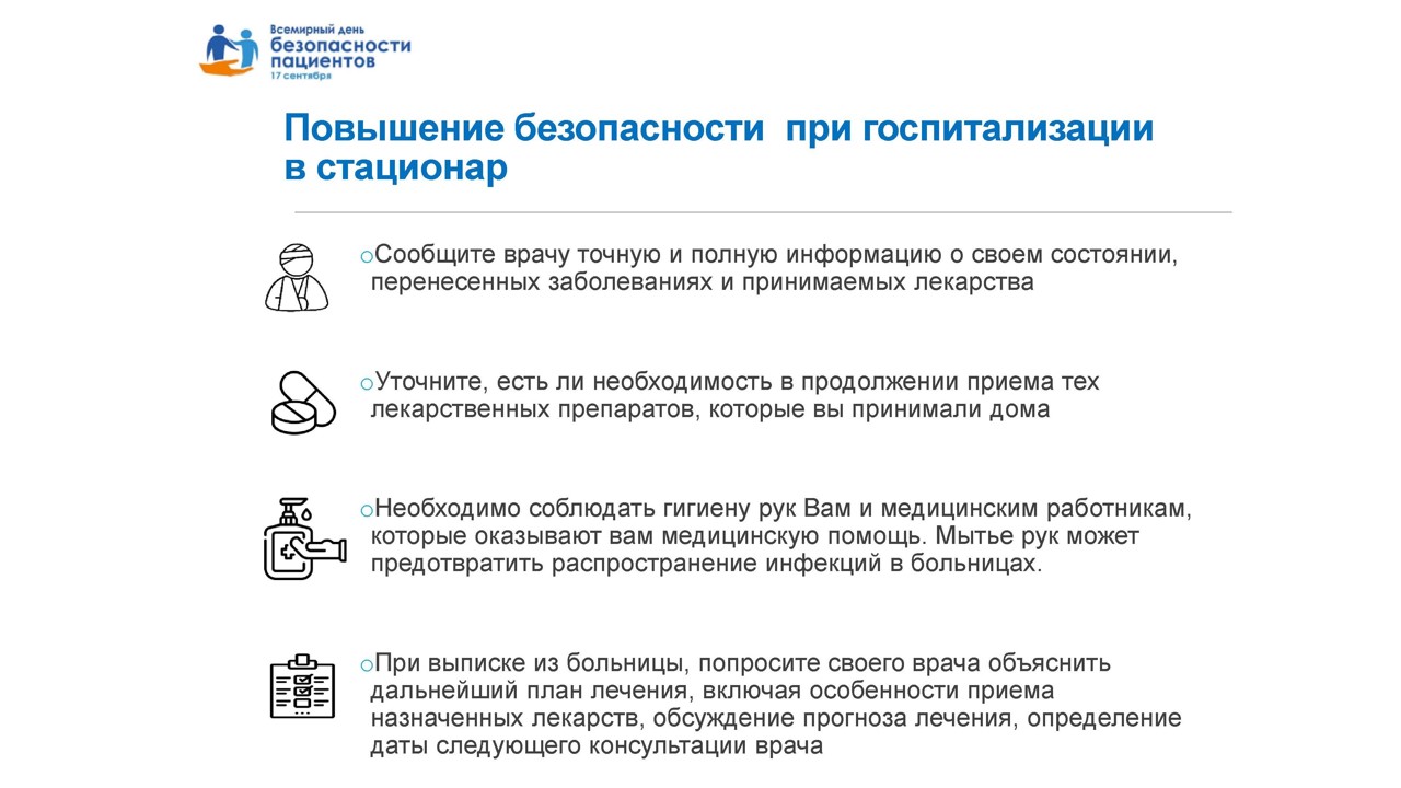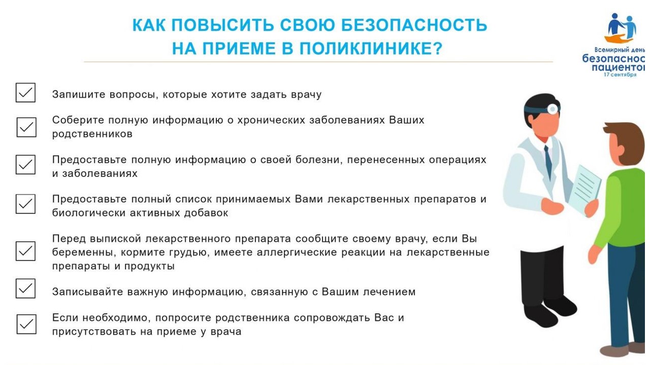 Всемирный день безопасности пациентов отмечается 17 сентября и служит поводом повысить осведомленность населения и укрепить сотрудничество между пациентами и медицинскими работниками, избегать ошибок в диагностике и лечении.