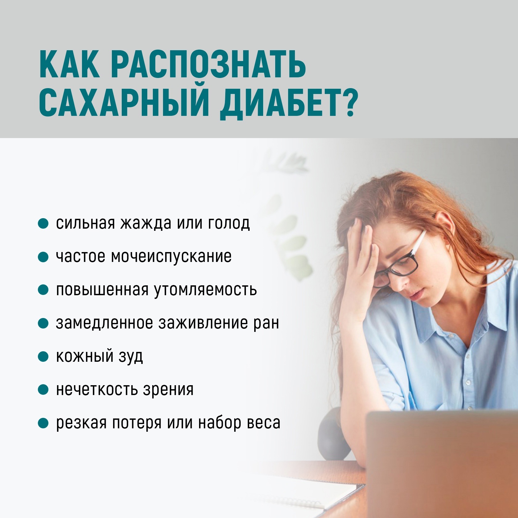 Сахарный диабет – коварное заболевание, с неспецифичной симптоматикой, в том числе — сухость во рту, немотивированная слабость, утомляемость, резкий набор или снижение веса, может снижаться и повышаться аппетит, частые простудные заболевания, медленные заживления ран и порезов. Диабет опасен не сам по себе, а сердечно-сосудистыми, неврологическими и другими осложнениями(инфаркт миокарда, инсульт, закупорка артерий конечностей и др.). Заболевание неизлечимое, но контролируемое. Рекомендовано лишь много двигаться, сбросить лишний вес, следить за уровнем сахара и скорее всего, принимать лекарства. Кстати, доза их будет меньше, если вы больше двигаетесь, правильно питаетесь и имеете нормальный индекс массы тела.