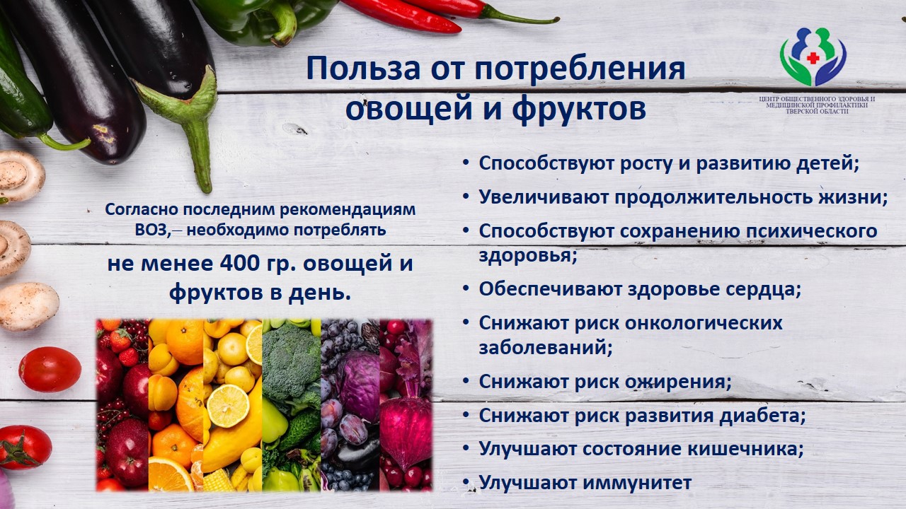 Свежие овощи и фрукты богаты клетчаткой, способствуют нормализации обмена веществ, хорошей работе сложного процесса всасывания и выведения в кишечнике. А это в свою очередь, нормализует уровень холестерина и глюкозы крови, улучшает иммунитет.