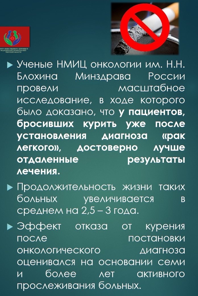 У вас еще есть время, чтобы улучшить прогноз для жизни и повысить качество жизни. Шанс закуривания у ваших детей будет намного меньше, если вы сейчас бросите курить!