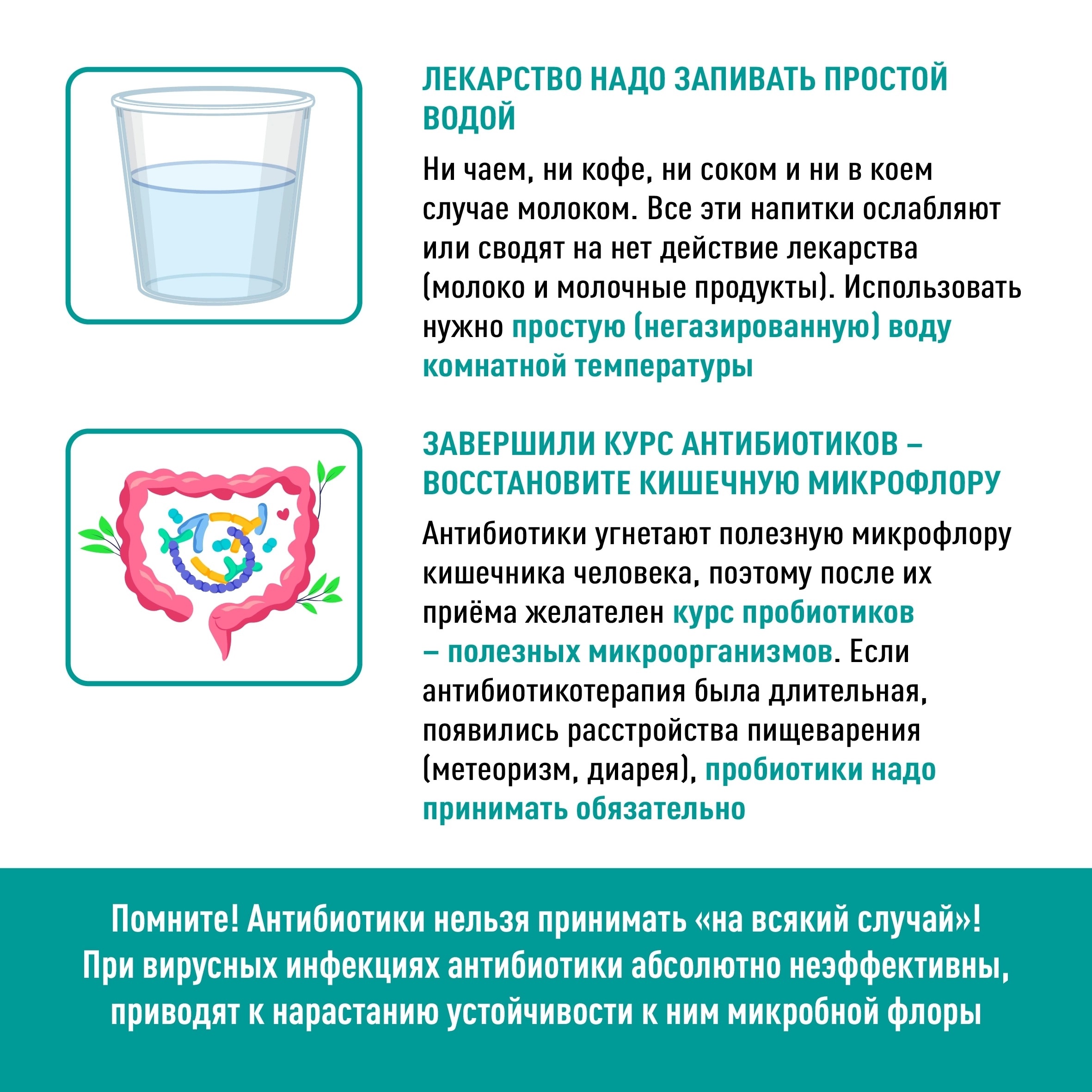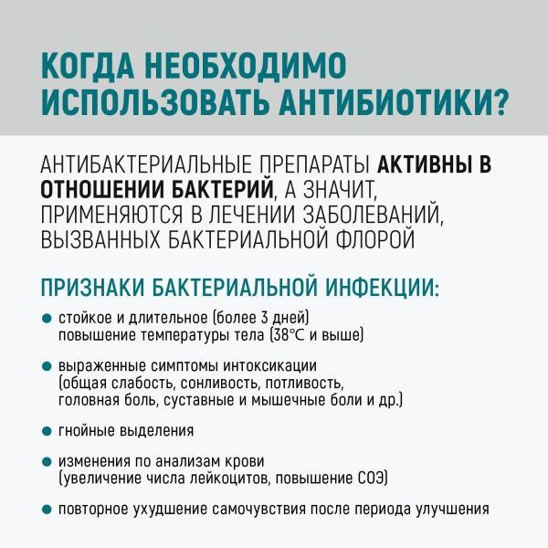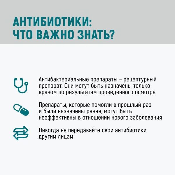 не принимайте антибиотики без назначения врача! Очень часто антибиотики начинают принимать неоправданно, в частности, при вирусных инфекциях. Однозначно заявляем: в этих случаях антибиотики неэффективны, а приводят к развитию резистентных штаммов.